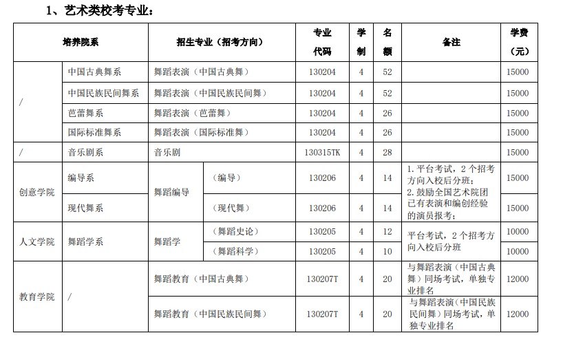 一、學(xué)校簡介 北京舞蹈學(xué)院是一所以高素質(zhì)舞蹈人才培養(yǎng)、高水平舞蹈理論研究和作品創(chuàng)作為主 要任務(wù)的全日制普通高等學(xué)校。學(xué)院前身為北京舞蹈學(xué)校,始建于 1954 年,是新中國第 一所專業(yè)舞蹈學(xué)校。1978 年經(jīng)國務(wù)院批準(zhǔn)正式成立北京舞蹈學(xué)院,隸屬于文化部,2000 年劃轉(zhuǎn)北京市人民政府。學(xué)院具有學(xué)士和碩士學(xué)位授予權(quán),是中國唯一一所專門化的舞 蹈教育高等學(xué)府,也是當(dāng)今世界規(guī)模最大、專業(yè)設(shè)置全面的舞蹈知名院校,被譽為“舞 蹈家搖籃”。 近年來學(xué)院不斷深化舞蹈教育教學(xué)改革,現(xiàn)設(shè)有中國古典舞系、中國民族民間舞系、 芭蕾舞系、國際標(biāo)準(zhǔn)舞系、音樂劇系、舞臺美術(shù)系、創(chuàng)意學(xué)院(含編導(dǎo)系、現(xiàn)代舞系、 影像新媒體中心)、人文學(xué)院(含舞蹈學(xué)系、藝術(shù)傳播系、藝術(shù)理論部)、教育學(xué)院, 思想政治理論課教研部、繼續(xù)教育學(xué)院、附屬中等舞蹈學(xué)校等教學(xué)機(jī)構(gòu),共同形成具有 中國特色的舞蹈教育體系。學(xué)院現(xiàn)有在編教職員工近 600 人,全日制在校生 2400 余人(本 科生 1300 余人、研究生 300 余人、附中學(xué)生 800 余人),繼續(xù)教育學(xué)院現(xiàn)有學(xué)歷和非學(xué) 歷教育學(xué)生約 7000 余人,舞蹈考級院每年在海內(nèi)外培訓(xùn)舞蹈考級師資超 10 萬人次,約 120 萬學(xué)生參加舞蹈等級考試。 建校以來,學(xué)院認(rèn)真貫徹黨的教育方針和文藝方針,以引領(lǐng)和推動中國舞蹈教育事 業(yè)改革與發(fā)展為己任,以“為人民而舞,為時代建功”為價值追求,堅持立德樹人,全 面履行人才培養(yǎng)、科學(xué)研究、社會服務(wù)、文化傳承與創(chuàng)新、國際交流合作等重要職能, 努力建設(shè)中國特色世界一流舞蹈大學(xué)。 2025 年本科招生簡章 3 / 22 二、招生計劃 2025 年北京舞蹈學(xué)院本科藝術(shù)類校考專業(yè)招生 274 人(計劃數(shù)以上級主管部門最終 批復(fù)為準(zhǔn)),編制分省計劃的非校考專業(yè)、港澳臺及華僑學(xué)生、外國留學(xué)生不含在此計 劃數(shù)中。 按照有關(guān)文件的要求,我院舞蹈表演、舞蹈編導(dǎo)、舞蹈學(xué)、舞蹈教育、音樂劇五個 校考專業(yè)面向全國招生,不編制分省計劃,所有藝術(shù)類校考專業(yè)(含招考方向)均為文 理兼招,不設(shè)選考科目要求。 戲劇影視美術(shù)設(shè)計專業(yè)使用省級統(tǒng)考成績錄取,編制分省計劃;藝術(shù)管理專業(yè)使用 高考成績錄取,編制分省計劃。對于設(shè)置分省計劃的專業(yè),如遇投放計劃省(區(qū)、市) 相應(yīng)批次分為歷史類/物理類(文史類/理工類),則只編制歷史類/文史類計劃。 各招考方向擬招名額如下: