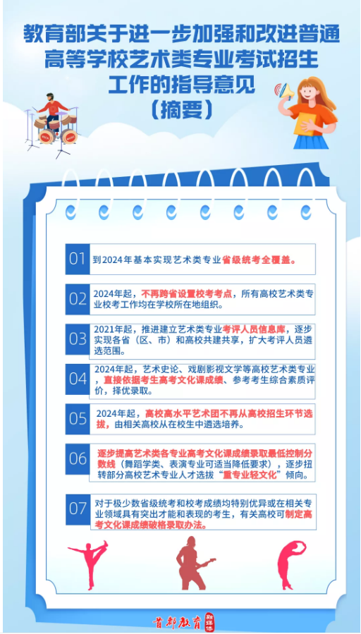 到2024年基本實現(xiàn)藝術(shù)類專業(yè)省級統(tǒng)考全覆蓋,2024年起,不再跨省設(shè)置校考考點;2024年起,高校高水平藝術(shù)團(tuán)不再從高校招生環(huán)節(jié)選拔,由相關(guān)高校從在校生中遴選培養(yǎng)。