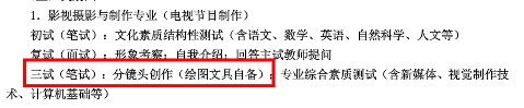 面試考試的考察內(nèi)容為:①自我介紹 ②回答考官提問(wèn) ③圖片分析 ④作品展示 ⑤實(shí)拍。其中實(shí)拍是考的最少,只有四川音樂(lè)學(xué)院、上海視覺(jué)學(xué)院、吉林動(dòng)畫學(xué)院三所院校有所涉及。