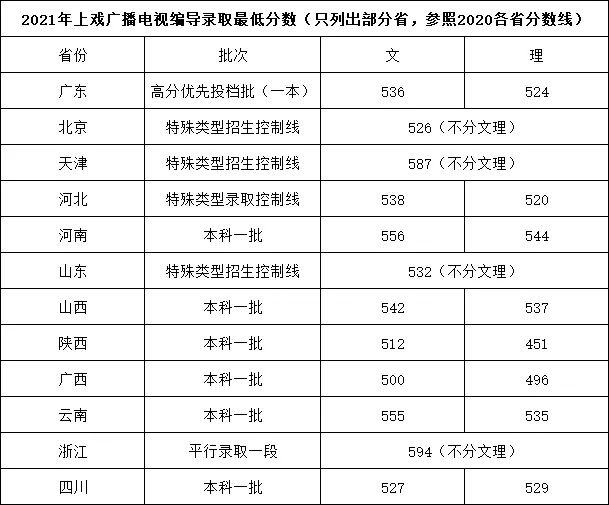 按照其2021年錄取辦法以及2020年的錄取比值,要進上海戲劇學(xué)院廣播電視編導(dǎo)專業(yè)分?jǐn)?shù)最高和最低分?jǐn)?shù)應(yīng)為多少呢?,請看下圖(參考2020年各省錄取分?jǐn)?shù)線):