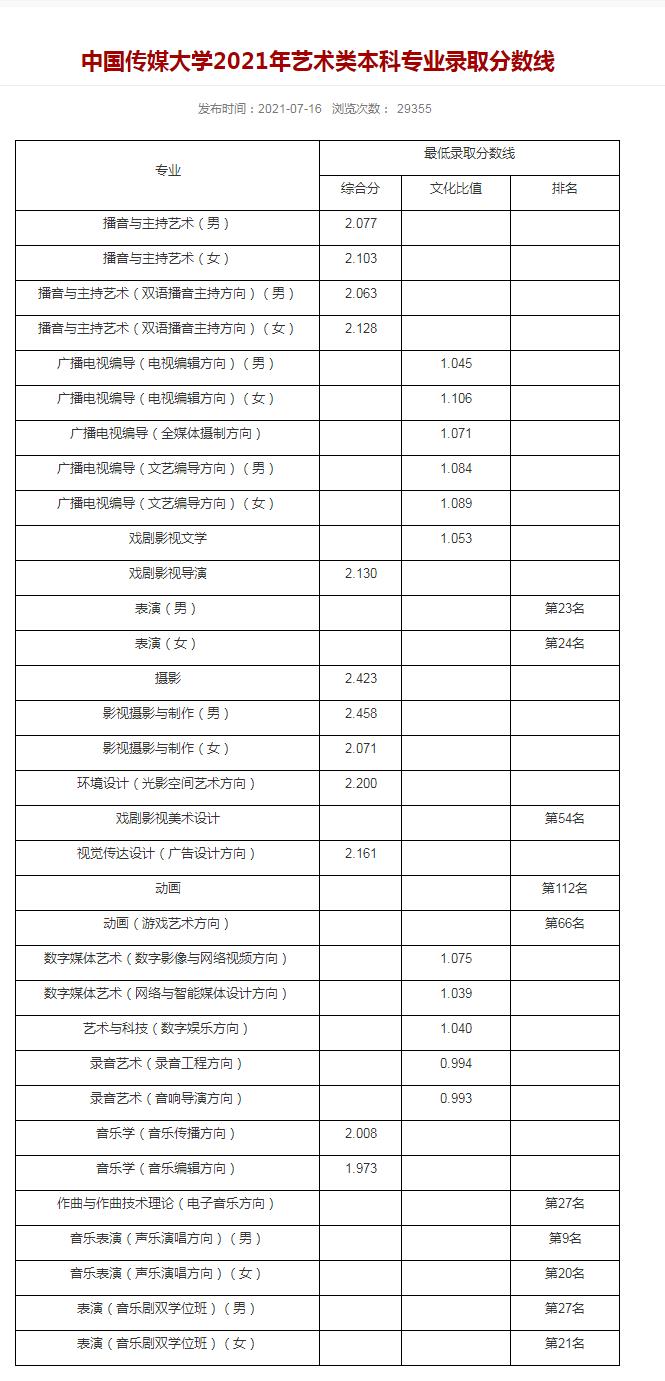 我們整理了中國傳媒大學2021年藝術類本科專業錄取分數線,大家可以參考!