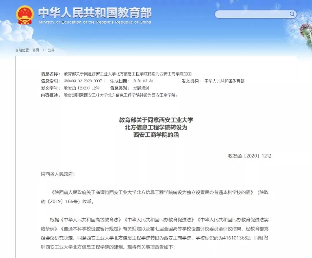 西安工商學院(原西安工業大學北方信息工程學院)2020年3月30日經國家教育部、陜西省人民政府批準、陜西省教育廳備案轉設為全日制本科民辦普通高等學校。