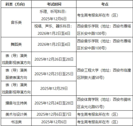 一、報名 報考藝術類專業的考生,必須參加我省高考報名,報考科類只能選擇為藝術類(歷史)或藝術類(物理)。 (一)省級統考報名 擬報考藝術類專業課省級統考的考生,須于2025年11月1日9∶00至11月7日17∶00使用高考報名號及密碼登錄陜西省教育考試院門戶網站(https://www.sneea.cn)或陜西招生考試信息網(https://www.sneac.com),在高考網上報名及繳費的同時,完成藝術類專業課省級統考報名及繳費,繳費方式與高考網上報名相同。省級統考科類一經確認不得更改。 我省藝術類專業課省級統考分為音樂類、舞蹈類、表(導)演類、播音與主持類、美術與設計類、書法類6個科類,考生只能在其中選擇1個科類報考,不得兼報。音樂類專業課省級統考分為音樂教育、音樂表演2個招考類別,考生可以兼報;音樂表演招考類別又分為聲樂、器樂2個方向,考生只能在其中選擇1個方向報考,不得兼報。表(導)演類專業課省級統考分為戲劇影視表演、服裝表演、戲劇影視導演3個方向,考生只能在其中選擇1個方向報考,不得兼報。 報考音樂類、舞蹈類、表(導)演類戲劇影視表演方向、表(導)演類服裝表演方向的考生,還須填報或上傳相關資料,具體方式詳見報名系統公告。 藝術類本科考試招生專業目錄詳見《陜西省招生委員會關于印發陜西省加強和改進普通高等學校藝術類專業考試招生工作實施方案(試行)的通知》,藝術類高職(專科)專業參照執行。考生須在省級統考報名前咨詢擬報考院校,主動了解擬報考院校藝術類專業與我省省級統考科類的對應關系,各招生院校要明確告知考生須參加我省省級統考的科類(招考類別、方向)。 (二)高校校考報名 藝術類專業課校考報名及考試辦法由各招生院校確定,考生可直接向擬報考的招生院校咨詢。報名時,如須提供《藝術類專業課考試報考證》,考生可于2025年11月25日后登錄陜西省教育考試院門戶網站或陜西招生考試信息網下載。 二、考試 (一)省級統考 各科類藝術類專業課省級統考考務辦公室負責省級統考的組織實施。音樂類、舞蹈類專業課省級統考考務辦公室設在西安音樂學院。表(導)演類專業課省級統考考務辦公室設在西安工程大學。播音與主持類專業課省級統考考務辦公室設在西安體育學院。美術與設計類、書法類專業課省級統考考務辦公室設在西安美術學院。音樂類樂理、聽寫科目,美術與設計類,書法類考試的組考工作由各市(區)招生考試機構負責。 各科類(方向)考試時間和考點安排如下: 考生參加考試的時間以準考證為準。音樂類樂理、聽寫科目,美術與設計類,書法類準考證可于考試前一周登錄陜西省教育考試院門戶網站或陜西招生考試信息網下載并打印。音樂類視唱、聲樂、器樂科目,舞蹈類,表(導)演類,播音與主持類準考證可于考試前一周登錄組考院校網站下載并打印。 藝術類專業省級統考考試說明詳見《陜西省招生委員會關于印發陜西省加強和改進普通高等學校藝術類專業考試招生工作實施方案(試行)的通知》。 (二)高校校考 藝術類專業課校考實施辦法由各招生院校負責制定并向社會公布,實施辦法必須符合教育部和我省關于藝術類專業考試招生的有關規定。 組織校考的招生院校不得接受我省相應類別省級統考不合格考生參加校考,省級統考成績不合格考生參加院校相應專業組織的校考,其校考成績一律無效。違反上述規定產生的遺留問題,責任由招生院校和考生自負。各招生院校藝術類專業課校考成績只適用于本校錄取。 (三)成績發布 藝術類專業課省級統考成績將于2026年1月底公布。成績公布后考生如對本人成績有疑問,在規定時間內可提出成績復核申請,考生成績復核內容包括考生個人相關信息、是否考生本人答卷、是否有漏評、得分是否漏統(登)、分數合計是否準確。成績復核不重新評分,評分標準、評分細則的寬嚴問題不在復查范圍之內。考生不得查看答卷和面試錄像。 三、有關要求 (一)嚴格保密制度。各市(區)、縣(區、市)招生考試機構、各組考院校要加強試題、試卷的安全保密管理。藝術類專業課考試試題(卷、卡)的領取、運送、保管、分發、回收、評卷等環節要嚴格按《國家教育考試考務安全保密工作規定》執行,務必確保試題(卷、卡)安全保密、萬無一失。要加強對命題、評卷(面試)和監考教師等考試工作人員的崗前教育培訓。要針對當前考試安全保密的新形勢、新特點以及藝術類專業課考試的特殊性,開展規范化、專業化的全員業務培訓,強化職業道德和法紀警示教育,增強安全保密觀念和遵紀守法意識。 (二)嚴格考務管理。各市(區)、縣(區、市)招生考試機構、各組考院校要制定詳細嚴密的藝術類專業課考試實施方案,建立健全考試組織的各項規章制度,務必做到考試、評卷(評分)、登分、統計合成等各個環節規范嚴謹。嚴把考試入口關,通過“人臉識別”“人證識別”“智能安檢門”等現代化技術手段,嚴防考生替考和攜帶手機等違規物品進入考點。嚴把考試組織關,嚴格落實考生、評委、考場隨機編排的“三隨機”工作機制,嚴防考試舞弊。針對可能出現的各種情況和突發事件制定應急預案,提前做好應急演練,確保考試安全順利進行。 (三)嚴格評分評卷。各組考院校要嚴把考試評分關,完善專業考試評分標準,評委現場獨立打分、全程錄音錄像等方式,確保評分公平公正