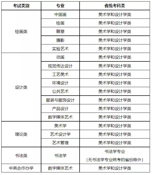 二、本科招生專業考試各專業對應考試類別及省統考科類如下: