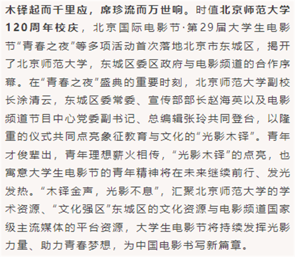 北京師范大學副校長涂清云,東城區委常委、宣傳部部長趙海英以及電影頻道節目中心黨委副書記、總編輯張玲三方聚力,點亮木鐸