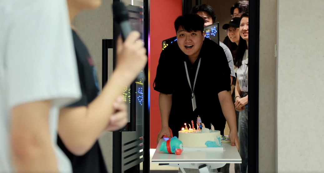 開營儀式的尾聲,燈光突然暗下。輕快的生日歌旋律從角落悄然響起,推著蛋糕的工作人員緩緩走出,蛋糕上跳躍的燭光映亮全場。