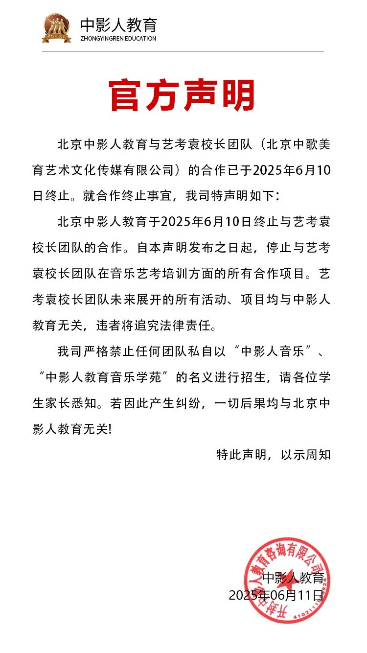 關(guān)于終止與藝考袁校長(zhǎng)團(tuán)隊(duì)合作的聲明