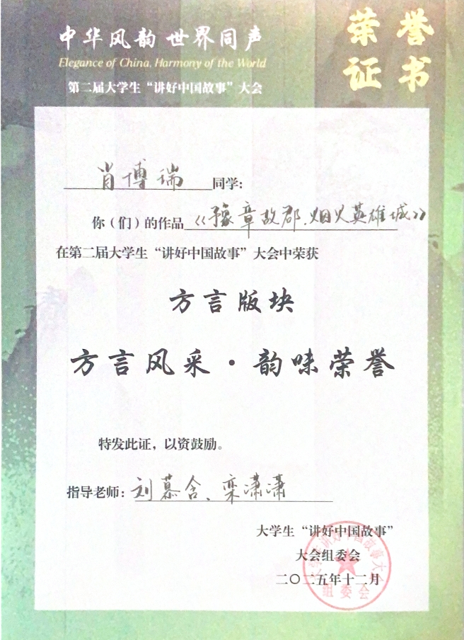 中影人犀牛播音學員肖博瑞憑借出色的表現,在大賽中脫穎而出,憑借作品《豫章故郡,煙火英雄城》,獲得方言板塊賽道“方言風采·韻味”榮譽。